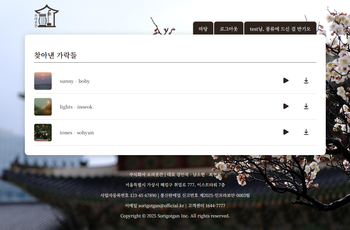 회원가입/로그인, 음악 검색, 재생, 다운로드 기능 구현 실제 음원 파일은 NFS 서버를 통해 제공